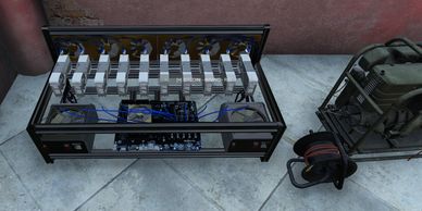 First deploy your mining rig. Next you will need to attach your fans to the fan bar and the fan bar will need attached to the mining rig. Now attach your two power supply units, heat sync, USB and your ten GPUS.